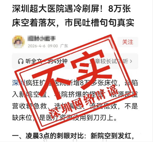 近日,有网络信息关注深圳新建医院运营情况,称“深圳超大医院遇冷,八万床位空置”,引发关注。经核查,该信息纯属谣言,严重失实。